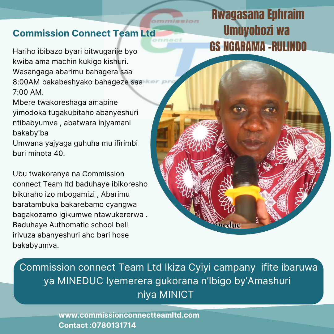 NYAGATARE District/ GS TABAGWE Umuyobozi w' Iki Kigo Ikoranabuhanga ryamufashije byinshi mu miyoborere, Hehe no kwibwa Computer biturutse ku burangare, Hehe n'Amakimbirane yaturukaga mukubeshya attendance kubarimu bitewe no gusinya mugitabo hehe no kongera gutuma umwana kuvuza ifirimbi cyangwa gukubita kuri kadende! Aravuga imbogamizi baterwaga no gukoresha ibitabo muri attendance, ko baruhutse amakimbirane yabaga mukigo aturutse ku kuba abarimu barasinyaga mubitabo bakabeshya amasaha bahagereye wabavumbura mukaburana cyangwa hakavamo no gushwana. Ikoranabuhanga ry'inzogera naryo ryabafashije kutongera gutuma umwana ngo ajye gusona kuri kadende cyangwa ifirimbi, kadende bayibibye incuro 3 bayijyana munjyamani. ALARM SECURITY YO RWOSE YO NI INYAMIBWA HEHE NO KWIBWA COMPUTER, NGO ARARYAMA AGASINZIRA, URAMUTSE USHATSE KWIBA TELEPHONE IHITA IMUMENYESHA, YASANGIJE abandi bahanganye n' Iki kibazo igisubizo cyacyo / UMUSHINGA USHYIGIKIWE NA MINISTERI Y'UBUREZI, DUFITE IBYANGOMBWA BIBYEMEZA 0788477092 TURAKOPA!